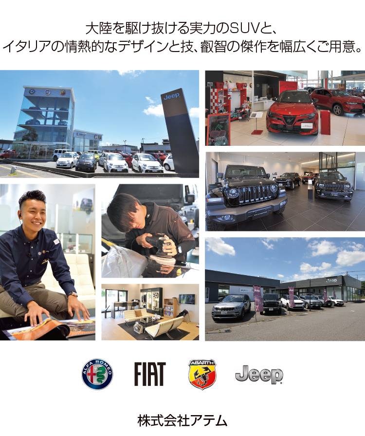 | ●ステランティス正規ディーラーとして、アルファロメオ、フィアット、アバルト、ジープの新車・中古車販売 ●自動車用部品 ●オフィシャルグッズ販売 ●自動車の点検・整備事業 ●保険代理店業務 その他 |